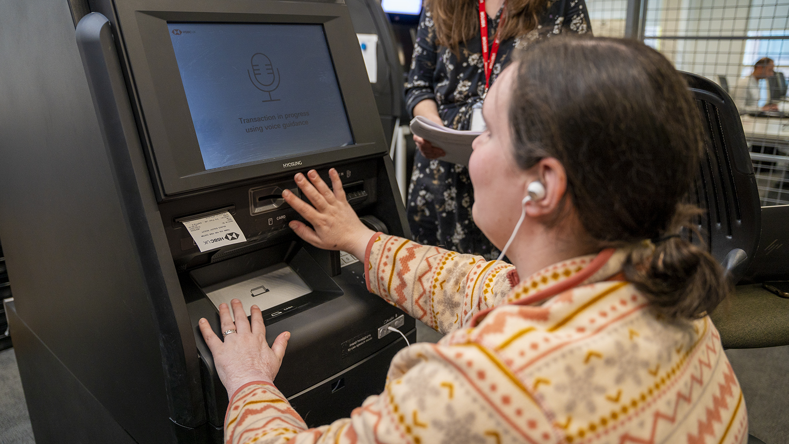 Prompted by an accessibility consultant, she plugs her headphones into the machine to activate the voice guidance and goes through the tasks one by one. Her guide dog sits patiently at her feet.
